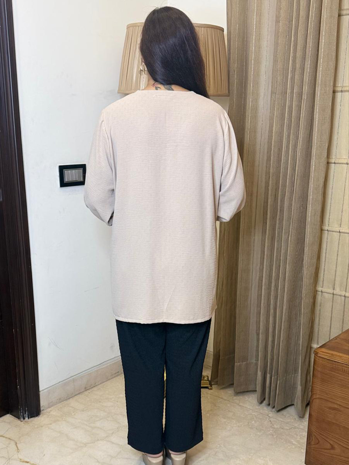 Turn heads in our Beige Top with Intricate Thread Work, crafted from stretchable crushed lycra that hugs your curves while keeping you comfy all day long. The soft sheen, flattering fit, and flowy design make it a wardrobe must-have for every occasion.