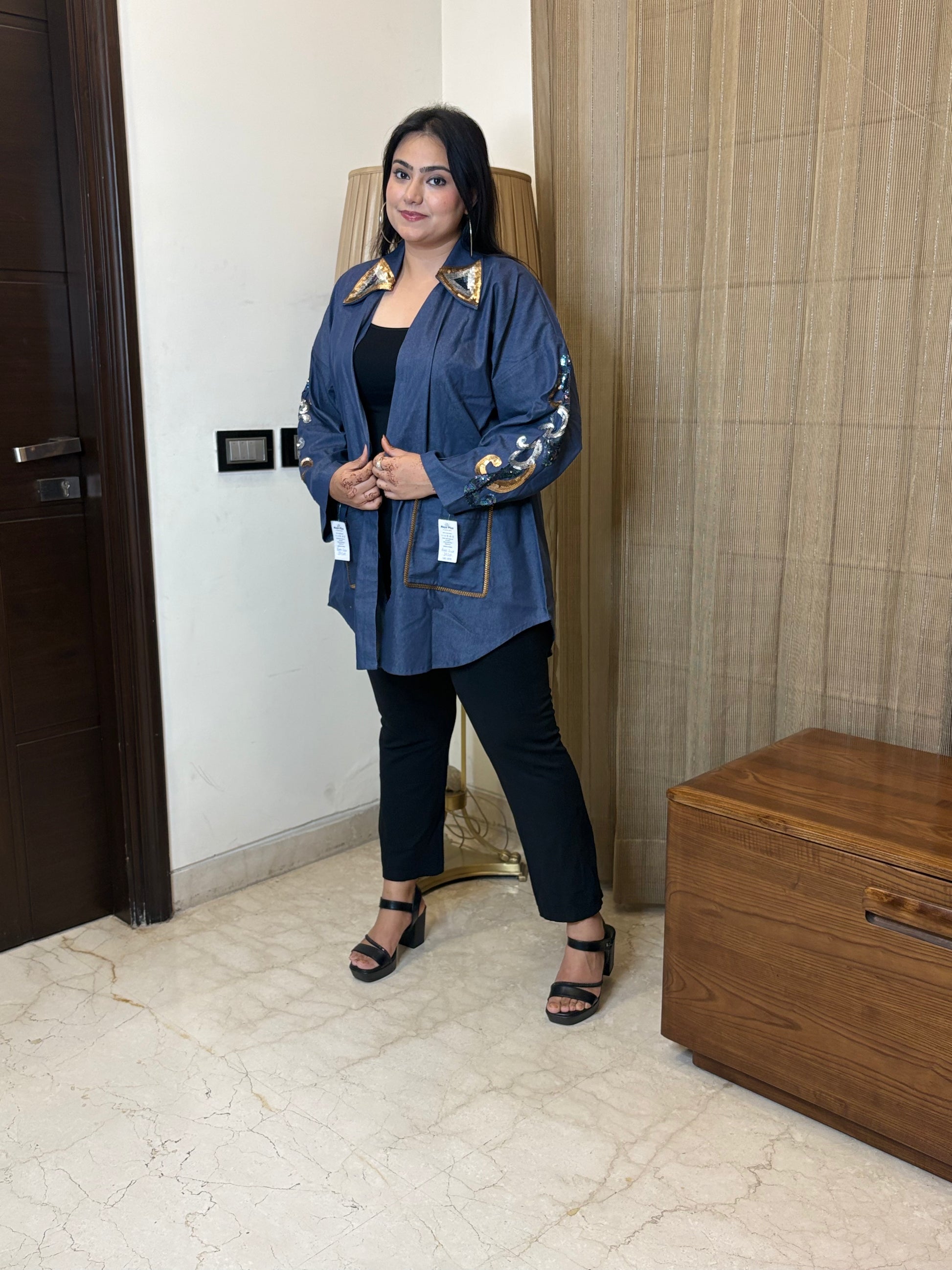 Turn heads with our Denim Flap Dress featuring intricate handwork detailing that adds a touch of elegance to everyday style. Crafted from soft denim with full lining, this dress offers a flattering fit and a flowy silhouette that moves with you — perfect for day-to-night wear. The smooth fabric feels as good as it looks, keeping you effortlessly stylish and comfortable all day long.