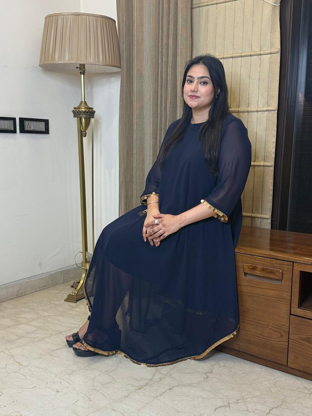 Turn heads in this stunning navy blue georgette dress, beautifully accented with shimmering coin detailing. The soft georgette fabric with full lining drapes effortlessly, giving you a flattering fit that moves with grace. Its smooth texture and flowy silhouette add an elegant touch — perfect for day-to-night glam!