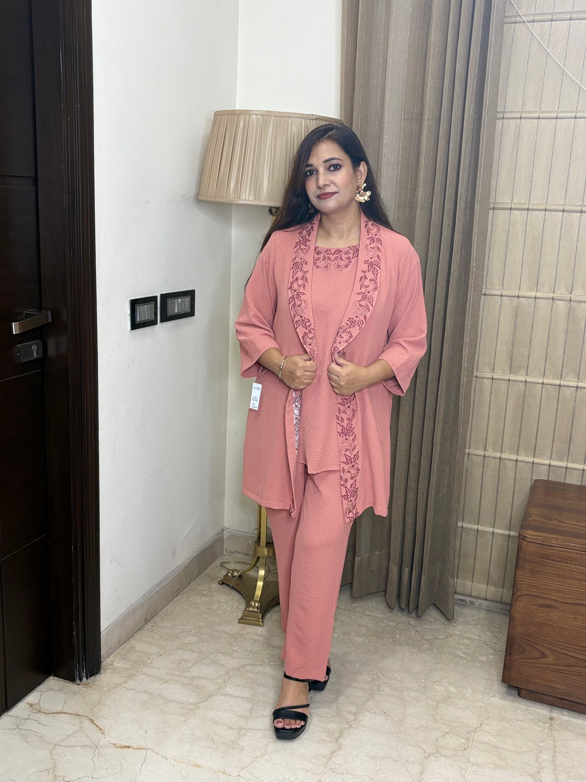 Effortlessly elegant, endlessly comfortable! Crafted from stretchable threaded fabric, this three-piece co-ord set offers a flattering fit with a smooth, flowy drape that enhances your natural charm. Perfect for brunch dates, get-togethers, or chic outings — it’s all about style that moves with you!