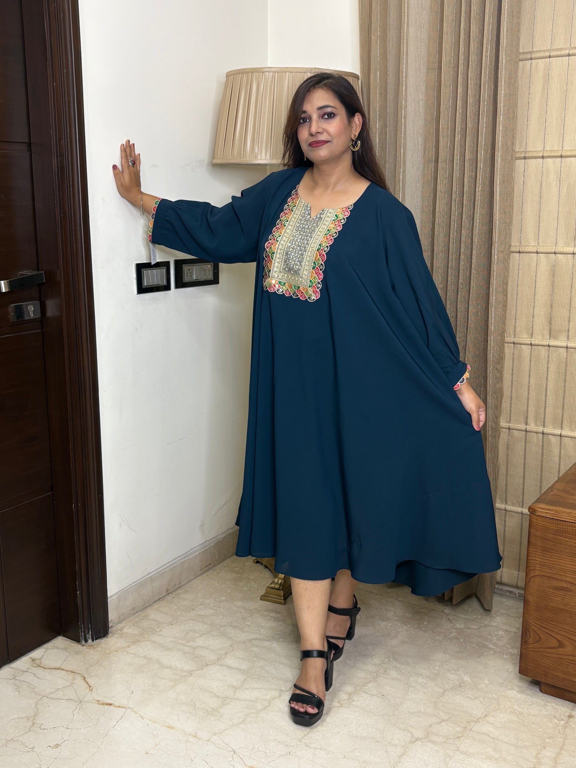 Turn heads in this stunning teal blue dress featuring intricate work on the neckline. Crafted from thick georgette with lining, it offers a flattering fit that hugs in all the right places while letting you move with ease. The smooth, flowy fabric drapes beautifully, bringing out your natural grace and keeping you super comfortable all day long.
